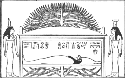 Isis, before setting out to go to her son Horus, who was brought up in Buto, had deposited the chest where Osiris was in a secluded place. But Typhon, one night when he was hunting by moonlight, found him, recognized the body, cut it into fourteen pieces and scattered them on all sides. Informed of what had happened, Isis set out to look for them, boarded a boat made of papyrus and traveled through the marshes. […] This also explains why several tombs in Egypt are said to be the tomb of Osiris, because Isis, it is said, raised a tomb each time she discovered a section of the corpse. —Plutarch, On Isis and Osiris,§ 18. Translation by Mario Meunier[43]