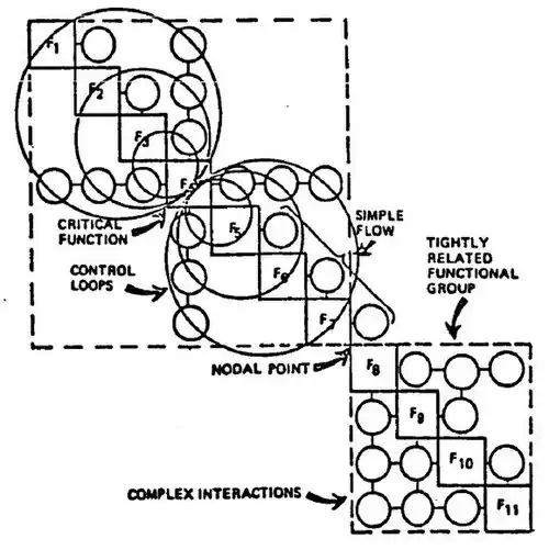 Where a blank appears, there is no interface between the respective functions. Data flows in a clockwise direction between functions (e.g., the symbol F1 → F2 indicates data flowing from function F1, to function F2). The data being transmitted can be defined in the appropriate squares. Alternatively, the use of circles and numbers permits a separate listing of the data interfaces. The clockwise flow of data between functions that have a feedback loop can be illustrated by a larger circle called a control loop. The identification of a critical function is also shown in Figure 3, where function F4 has a number of inputs and outputs to all other functions in the upper module. A simple flow of interface data exists between the upper and lower modules at functions F7 and F8. The lower module has complex interaction among its functions. The N2 chart can be taken down into successively lower levels to the hardware and software component functional levels. In addition to defining the data that must be supplied across the interface, the N2 chart can pinpoint areas where conflicts could arise.[4]