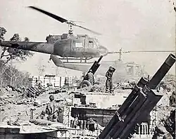 US forces sometimes employed sophisticated airmobile tactics, using integrated helicopter landings, artillery support, and troop insertions to surround enemy contacts and close off escape routes. The outstanding mobility of the helicopter made this possible, and these versatile machines could be sent into action in several configurations (troop transport, gunship, med-evac, heavy lift and supply). Helicopters allowed transport and deployment of infantry, artillery, medical, and supply elements to almost any location, presenting a formidable instrument that enhanced American and ARVN operations. When combined with other aerial elements such as fixed wing air support this combat power was multiplied, and opened up a whole new dimension of operational maneuver.[26] But helicopters also had several vulnerabilities. They required a vast and expensive "logistical tail" of maintenance, fuel, munitions and bases. No nation except the US could afford such expense- fielding some 12,000 machines in Vietnam, almost half of which were shot down or lost due to accidents.[27] The ability of helicopters to move men and material anywhere was impressive but also meant US and ARVN troops in some instances were heavily dependent on them. Destruction of the helicopter lifeline could derail an operation or maneuver, and the need to air-transport men and material to remote locations meant every new arrival of medevac, supply, transport or troop flights gave the VC/PAVN opportunities to cripple missions and machines. Helicopters were also very vulnerable to heavy machine guns, light AA artillery, Man-portable air-defense systems like the SA-7 and even concentrated small arms fire. According to some historians of airpower, costs were sometimes not commensurate with gains, and US airmobile operations might boil down to hugely expensive machines and their support systems chasing a handful of teenagers or second-string militiamen armed with cheap rifles.[28]
