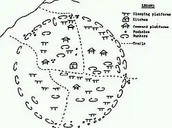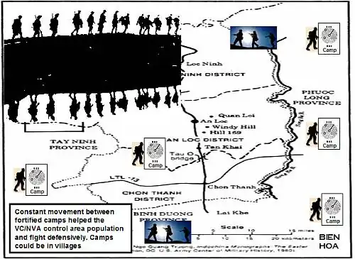 The standard camp was roughly circular and consisted of 2-lines of fortification, incorporating individual fighting positions, bunkers and trenches. Semi-permanent or permanent base camps contained more elaborate fortification. A typical VC/PAVN battalion generally spread out its companies at one-hour intervals across an area, balancing the need for quick dispersal with opportunity to concentrate as needed.[17]