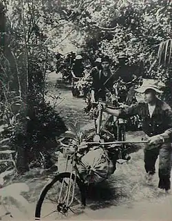 Load bearing by porters was greatly enhanced by the use of ingenious "steel horses" – bicycles specially modified by widening the handlebars, strengthening the suspensions and adding cargo pallets. Guided by two men, the specially modified bikes could move 300–400 pounds, several times that of a single porter.[23] Older men made up many of the long-term laborers as those younger were drawn off into combat and female labor was used extensively in a wide range of logistics tasks.[24]