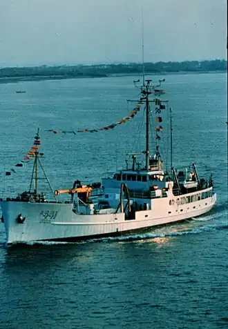 NOAA had limited funding during its first three years of existence between 1970 and 1972, forcing it to reduce ship operations and oceanographic studies.[4] This led NOAA to decommission George B. Kelez near the end of 1972, and she never returned to fisheries research work.[4] However, in March 1973 NOAA recommissioned her and loaned her to the United States Geological Survey for use in Southern California.[4] In late 1974, NOAA moved her to a new home port, NOAA's Atlantic Marine Center at Norfolk, Virginia, and on 6 December 1974 opened bids for repair work to the ship.[4]