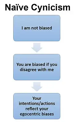 Naïve cynicism is a philosophy of mind, cognitive bias and form of psychological egoism that occurs when people naïvely expect more egocentric bias in others than actually is the case.
