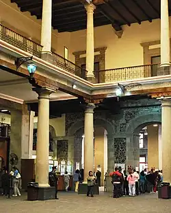 Operations began in 1775 in the College of Saints Peter and Paul and where the current main office is now.[6] In 1818, Don Viceroy Apodaca ordered the evacuation of the building due to problems with the Independence movement but this did not happen until 1821, when King Ferdinand VII confiscated Jesuit properties.[1] The foundation moved to the Franciscan Convent of Saint Bridget that was on Juárez Avenue and San Juan de Letrán Street (now Eje Central).[1][6] It moved again in 1836 to two houses on Empedradillo Street off a difference section of the Zocalo that were owned by the Duke of Monteleone,[6] a descendant of Hernan Cortés.[4] Some time after the College of Saints Peter and Paul moved to what is now the Colegio de San Ildefonso, the Monte de Piedad bought the old college structure and its original home from the Duke of Monteleone in 1836.[3][4][6]