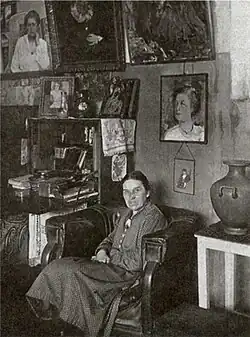 In the Sapozhnikova's studio, Fechin made carved furniture in a Neo-Russian style (most of the objects have not been preserved). Painter spent his time there every day; he wrote in this studio many of his famous works, such as "Portrait of Varya Adoratskaya" who was a niece of Sapozhnikova. As a painter, Nadezhda, in general, specialized on portraits, together with Fechin participating in the Kazan exhibitions.[1] In 1913, Sapozhnikova initiated the establishment of the handicraft industry museum industry dedicated to the Kazan provincial zemstvo. For this purpose, two students of the Tatar gymnasium of Aitova were sent to her studio.[8]
