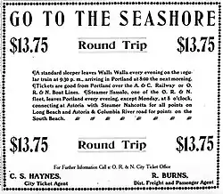 - ^ "Go to the Seashore", Walla Walla Evening Statesman (advertisement), vol. 33, no. 27, Walla Walla, Washington, 6, col.3, Aug 22, 1906