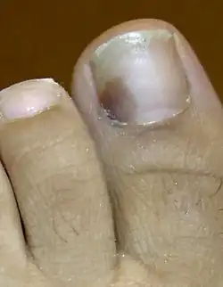 - Melanonychia, a black, brown or grey discoloration of the nail, with numerous causes.