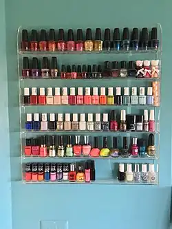 Nail polish (also known as nail varnish in British English or nail enamel) is a lacquer that can be applied to the human fingernails or toenails to decorate and protect the nail plates. The formula has been revised repeatedly to enhance its decorative properties, to be safer for the consumer to use, and to suppress cracking or peeling. Nail polish consists of a mix of an organic polymer and several other components that give it colors and textures.[1] Nail polishes come in all color shades and play a significant part in manicures and pedicures.