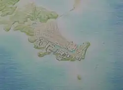 Najima Castle was located on a peninsula projecting into Hakata Bay on the north of the estuary of the Tatara River. The castle fundamentally consisted of the hon-maru or primary kuruwa, the ni-no-maru or secondary kuruwa, and the san-no-maru or tertiary kuruwa, respectively ranging from west to east, and extending for over 900 meters or 2953 ft.[1] The hon-maru, presumably the highest place in the castle, is now about 25 meters or 82 ft. above sea level.[2]