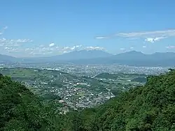 Located at the southeastern edge of the 甲府盆地 (甲府盆地), Nakamichi is the southern gateway to Kōfu. Long and narrow in shape, the town is traversed from north to south by National Route 358. The northern part is a floodplain on the left bank of the Fuefuki-gawa (笛吹川). The Takido-gawa (滝戸川), which flows into the Fuefuki, runs through the center of the town. To the south, the Sone Hills extend from the 御坂山地 (御坂山地), featuring small, rounded hills in the foreground. The southern part is part of the Misaka Mountains[2] · .[3] The municipality covers an area of 21.02 km2 (8.12 sq mi).[3]