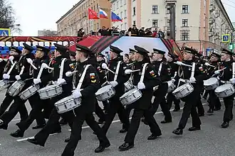 Today, all Nakhimov schools have the traditional honor of opening all Victory Day Parades in their local city with their corps of drums (sans Saint Petersburg since the 1990s). It also participated in the now defunct October Revolution Day parades. In 2015 Major General Timur Apakidze, a Soviet naval aviation pioneer who had died in a flying accident in 2001, was added to the rolls of the Nakhimov Naval School in perpetuity.[6] The general service march of the schools is the March of Nakhimovtsev (Марш Нахимовцев), written by Vasily Solovyov-Sedoi in 1949.[7] Students at the Nakhimov Naval School and its graduates are known as "Nakhimovites".[8]