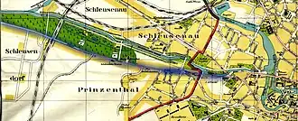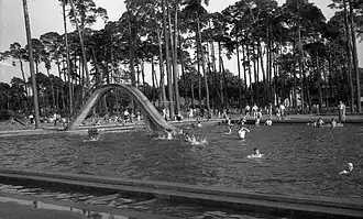 A general reconstruction with embellishments was carried out in 1936: in the park, there were a dozen of restaurants, cafes, beer gardens, playgrounds for children, as well as tennis courts, and a 9 ha leisure complex founded in 1928 by Sejm member Idzi Świtała.[22] The grounds were a propitious place for birds, with a lush vegetation: for 150 years, it has been considered as housing one of the largest colony of Thrush nightingales in Europe.[24] Some of the oldest trees were seen as natural curiosities such as a 36 m high black poplar with a trunk circumference of 300–500 cm.[25] The park started to become neglected in the 1960s, with the progressive expansion of Bydgoszcz and the unfavorable socio-economic climate: eventually, the old portion of the Canal became filled with rainwater and wastewater from the western part of the city.[25] In 1970, the decision of the municipal council to dry and fill the eastern section of the canal was the last straw: 624 m of canal, together with two locks and a bridge were destroyed to widen the thoroughfare.[9] This resulted in a decrease of the park area by one third, from 74 to 47 hectares, and for the Old Canal to become a dead branch, detached from Mill Island.