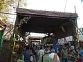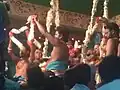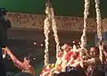In Thirumazhapadi, Vaidyanathasamy and His consort welcome the group of bridegroom to the accompaniment of music. Then they will be taken to the specially erected wedding mandapa.[5] The marriage festival is held in front of the devotees. After completion of the festival deeparadhana would be done. Later the celestial couples offer blessings. [6] The priests of the temple perform the marriage of Nandhi. As per the marriage ritual the couple would go around the ceremonial fire seven times. Shiva took the newly wed couple to seven Shiva temples around Thiruvaiyaru.[1] These seven temples are known as Saptha Sthanams. They are very close to each other and can be covered in one session. In the tamil month of Chittirai (April-May), the Deity (Utsavar) of Thiruvaiyaru is carried on a palanquin to all these temples.[7]