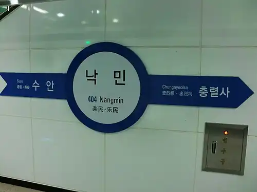 Nangmin Station (Korean: 낙민역; Hanja: 樂民驛) is an underground station of Busan Metro Line 4 in Nangmin-dong, Dongnae District, Busan, South Korea.