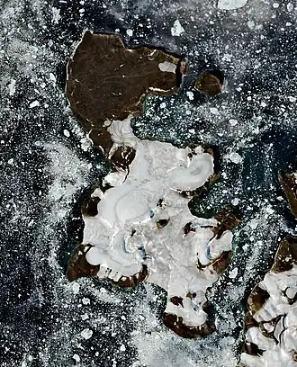 Ostrov Dzheffersona (Остров Джефферсона), Jefferson Island is a much smaller island lying off Nansen Island's southwestern shore. The island first appears as Jeaffreson Island on the maps of the Jackson-Harmsworth expedition.[4] Contemporary Arctic explorer J. Russel-Jeaffreson,[5] who helped with the preparation for the expedition,[6] may be the source for the name.