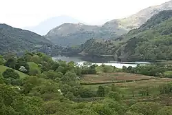 A mile further and the road passes Hafod Lwyfog, the summer homestead built in the 1540s, the birthplace of Sir John Williams, goldsmith to King James I, who in 1610 presented the Church of St Mary in Beddgelert with a fine chalice.[4] In 1938, the then owner, Clough Williams-Ellis presented part of the Hafod Lwyfog land to the National Trust in anticipation of the establishment of the Snowdonia National Park. A campsite now operates at the head of Llyn Gwynant, and the balance of the farm is managed as a conservation estate by descendants of Sir Clough Williams-Ellis.