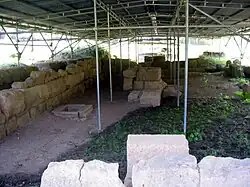 The cemeteries date from the 8th-6th centuries B.C. (the Villanovan and Orientalizing periods), representing perhaps four or five generations at the settlement.[25] The earliest tombs were well-tombs, dug pits with an urn at the bottom containing the cremated remains of the deceased.[26] Trench tombs later became more popular, following the growth of the trend toward inhumation.[27] It was typical for a small selection of goods to be buried with the cremated remains of the deceased.