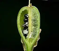 The fruit contains numerous subglobose seeds which are round and swollen with a hard coat, sometimes with an attached elaiosome. The testa is black[10] and the pericarp dry.[14]