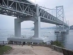 The whirlpools can be observed from the shore on Awaji island, from tourist ships, or from the Uzunomichi Walkway of the 1985 Ōnaruto Bridge spanning the strait. The suspension bridge has a total length of 1,629 m (5,344 ft), with the center span over the strait having a length of 876 m (2,874 ft) and a height of 41 m (135 ft) above sea level.