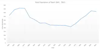 The most recent, 2011, census of the UK put the total population of Nash at 417.[1] The population has grown sharply since the lowest recorded population total of 214, which was found in the 1961 census.[12] The population previously went through a long period of decline between 1871 (when the highest total population of 460 was recorded) and 1961.[13]