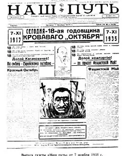 Nash Put' (Russian: Наш Путь, Our Way) was a daily newspaper founded by Konstantin Rodzaevsky on 3 October 1933, that was issued in Harbin[1] (1933–41) and Shanghai (1941-1943). The newspaper was the official organ of the Russian Fascist Party. Nash Put' was published until July 1943.[2] The newspaper promoted Christian Orthodoxy, Russian ultranationalism and fascism. Estimated circulation was 4,000. The paper was edited by Konstantin Rodzaevsky from 1933 to 1943.[3] There was also a publishing house, "Izdatel'stvo gazety Nash Put'" (Russian: «Издательство газеты "Наш Путь"», "Publisher of the newspaper Our Way").[4] In 1936 it published Vladimir Kislitsin's memoirs In the fires of the Civil War: Memoires.
