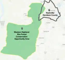 Delineation of NHRF was based on the U.S. Fish and Wildlife Service's (USFWS) Southeast Conservation Blueprint (SECAS Blueprint) database, used by multiple state, federal, and private organizations to rank and identify priority areas for conservation conservation throughout the southeast U.S. The Tennessee Wildlife Resources Agency (TWRA) collaborated with The Nature Conservancy and other partners to define the most prioritized conservation areas within the State of Tennessee, including the Western Highland Rim's forests, utilizing the SECAS Blueprint database and model.[11][12][13] Nashville includes a sizable portion of a large multi-county, conservation-priority area known as the Western Highland Rim Forests Conservation Opportunity Area (COA) identified by Tennessee in the TWRA 2015 State Wildlife Action Plan (SWAP).[12]