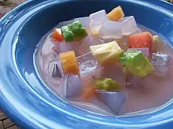 The translucent cubes in this fruit salad are "nata de coco" | |