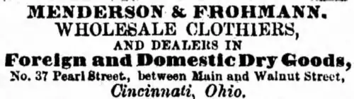 Menderson came to the United States from Bavaria in 1845,[4] and amassed a fortune. He operated his clothing store until retiring in the fall of 1886.[5] He was renowned for his generosity and gentle habits. In the words of his obituary, he was "simple, kindly, loving both his family and his fellow man better than himself."[6] Menderson and his wife had six children.[7] He is buried in Cincinnati's United Jewish Cemetery.[7]
