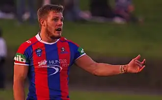 In 2014, he joined the Knights' New South Wales Cup side again on a 1-year contract, as their full-time fullback.[7][21] On 21 September 2014, he was named at fullback in the 2014 New South Wales Cup Team of the Year,[22] after scoring 17 tries in 16 games that season.[23] On 14 October 2014, he re-signed with the Knights on a 2-year contract,[24] almost signing with the Canterbury-Bankstown Bulldogs before the Knights decided to offer him a contract.[23]