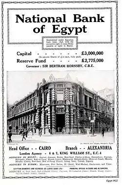 During the 25th of June [4] 1898, Sir Ernest Cassel (50% ownership), the three brothers Joseph Suares (1837–1900), Raphael Suares (1846–1909) and Felix Isaac Suares (1844–1906),[5] Moise Cattaui (25%) and Constantine Salvagos of Alexandria (25%) established the National Bank of Egypt (NBE), though Cassel remained in England. NBE established an agency in London.