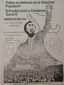 The official winner of the 6 July 1988 presidential election was Carlos Salinas de Gortari, in what has been widely considered a fraudulent election. Cárdenas protested against the alleged fraud, and he claimed victory for himself.[4] Cárdenas and the other leaders of the FDN held large-sclae protests against the fraud, but they were unable to prevent Salinas de Gortari from taking office.[4][5]