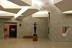 NGV international is located at 180 St Kilda Rd and houses the NGV's European, Asian, Oceanic and American art collections.[25] It houses a number of permanent displays, arranged by region and chronology.[26] It also has a large ground-floor space used for temporary exhibitions, and contemporary art spaces on level 3 are also used for temporary exhibitions.[26] The building is surrounded by a moat and fountains, while the main entrance features a famous water wall, which has been used to display the art of Keith Haring and others.[27][18] At the rear of NGV International is a sculpture garden, which hosts an annual large-scale installation through the NGV Architecture Commission.[28]