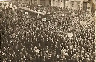 The party was established on 29 November 1920 by a merger of the Liberal Party (Radoslavists), the People's Liberal Party and the Young Liberals Party.[1] However, as the three parties had previously had pro-German foreign policies during World War I, other parties were initially unwilling to co-operate with the NLP.[1] In the April 1923 elections the party received 5.3 of the national vote, but failed to win a seat.[2] The party was involved in the June 1923 coup that overthrew the Bulgarian Agrarian National Union government,[1] and went on to win seven seats in the November 1923 elections after receiving 12% of the vote.[2][3]