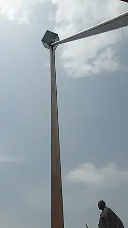 The monument is a 40-metre (130 ft) steel frame in "A" shape, symbolizing two hands. In order to protect it from sea coast weather, it is made up of a non-corroding material. At the apex of the monument, there is a 2.5-tonne (2,500 kg) glass cube representing the salt crystal. The cube is illuminated by laser lights at night which creates the illusion of a pyramid. Under the canopy of the cube, there is a 5-metre (16 ft) high statue of Gandhi projecting the forward march. In 2014, the statue was cast in sixty separate pieces at Mumbai, assembled into one statue and transported to Dandi, taking more than two years to complete.[6] It is sculpted by Sadashiv Sathe.[1]