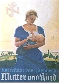 The NSV restricted its assistance from the very beginning to individuals of "Aryan descent" who met a range of conditions to be deemed worthy of support, officially stating that its aim was to promote "the living, healthy forces of the German people."[9] The list of those excluded from NSV benefits was composed of "alcoholics, tramps, homosexuals, prostitutes, the 'work-shy' or the 'asocial', habitual criminals, the hereditarily ill (a widely defined category), Communists, Socialists, Social Democrats, and members of races other than the Aryan."[9] Within these limitations, 17 million Germans received assistance under the auspices of NSV by 1939, and the agency operated 8,000 day-nurseries, funded holiday homes for mothers, distributed additional food for large families and was involved with a wide variety of other facilities.[9] It "projected a powerful image of caring and support" for those who were seen as full members of the German racial community, while also inspiring fear through its intrusive questioning and the threat of opening a Gestapo investigation on those who did not fulfill the criteria for support.[10]