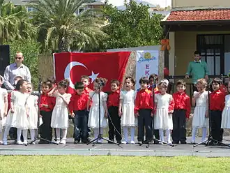 Every year, children in Turkey celebrate National Sovereignty and Children's Day as a national holiday. Similar to other April events, Children's Day celebrations are often held outdoors.[8] Schools participate in week-long ceremonies marked by performances in all fields in large stadiums watched by the entire nation.[8] Students decorate their classrooms with flags, balloons and handmade ornaments.[9][10] Anıtkabir is visited by children and politicians every year.[11] Among the activities on this day, the children send their representatives to replace state officials and high ranking civil servants in their offices. The President, the cabinet ministers, provincial governors, and mayors all turn over their positions to children's representatives in a purely ceremonial exercise.[12] On this day, children also replace the parliamentarians in the Grand National Assembly and hold a ceremonial special session to discuss matters concerning children's issues.[13][14]