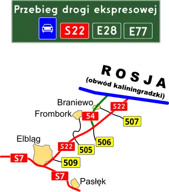 National road 54 (Polish: Droga krajowa nr 54) is a route belonging to the Polish national road network. The highway is a GP-class road,[1] 18 km (11 mi) long, located in the Warmian-Masurian Voivodeship. This route connects the Expressway S22 at the Braniewo-Południe junction near Chruściel with the Gronowo-Mamonovo border crossing near Russia.