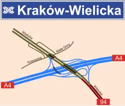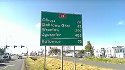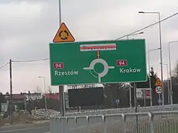 National Road 94 (Polish: Droga krajowa nr 94) is a road in Poland. It runs through 5 voivodeships: Lower Silesian Voivodeship, Opole Voivodeship, Silesian Voivodeship, Lesser Poland Voivodeship and Subcarpathian Voivodeship. It is a road of GP class and partially G class.[1] The road runs as a free alternative route for A4 motorway. National road 94 in large part runs along the old route of national road no. 4 and because of that it is colloquially called the old four by drivers. After the completion of the A4 motorway the formerly parallel-running national road no. 4 has become of secondary importance and serves as a backup route; it can be useful in case of a traffic collision or other source disrupting traffic on the A4.