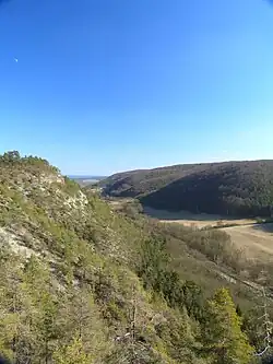 NSG Leutratal und Cospoth (often referred to simply as Leutratal) is an important nature reserve in Germany, southwest of the town of Jena. The reserve is maintained by Naturschutzbund Deutschland. The reserve contains the valley of the river Leutra and beech forest. The nature reserve measures 582.9 hectares. The bedrock is Muschelkalk (limestone).[1] In 2018, 23% of the reserve was pine forest and 16% broadleaf trees, 23% was xerothermic meadow, 9% brome semi-dry grassland and 14% agricultural use.[2] Rare tree species growing in the forests and on the slope include wild pear and wild service tree.