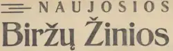 The Naujosios Biržų žinios (literally: New Biržai news) was the weekly (first few months - bi-weekly) county newspaper on matters of society, politics and literature.[1] It was published in the Biržai county.[1] It was published from 1941 to 1944.[1] A total of 131 issues were published.[2] It was the continuation of the Biržų žinios that was published from 1922 to 1933.[1] From 16 January 1943 to 8 July 1944, the newspaper was published under the old title Biržų žinios.[2]