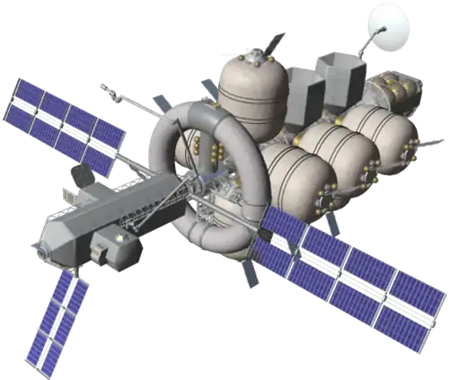 In order to deploy this massive spacecraft as easily as possible, it would consist of a variety of rigid and inflatable modules and solar dynamic arrays. The expandable modules are based on the technology used by the inflatable living quarters proposed by Bigelow Aerospace,[6] which has continued the development of inflatable modules initially designed and developed by NASA.[7]