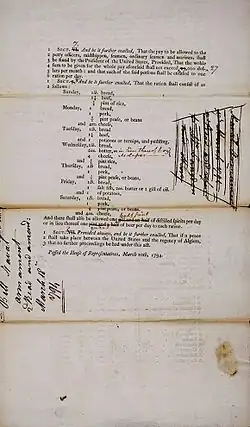 Sec. 8. And be it further enacted, That the ration shall consist of, as follows: Sunday, one pound of bread, one pound and a half of beef, and half a pint of rice:—Monday, one pound of bread, one pound of pork, half a pint of peas or beans, and four ounces of cheese:—Tuesday, one pound of bread, one pound and a half of beef, and one pound of potatoes or turnips, and pudding:— Wednesday, one pound of bread, two ounces of butter, or, in lieu thereof, six ounces of molasses, four ounces of cheese, and half a pint of rice:—Thursday, one pound of bread, one pound of pork, and half a pint of peas or beans:—Friday, one pound of bread, one pound of salt fish, two ounces of butter or one gill of oil, and one pound of potatoes:—Saturday, one pound of bread, one pound of pork, half a pint of peas or beans, and four ounces of cheese.—And there shall also be allowed one half pint of distilled spirits per day, or, in lieu thereof, one quart of beer per day, to each ration.