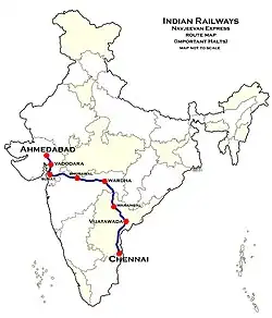 It operates as train number 12655 from Ahmedabad Junction to Chennai Central and as train number 12656 in the reverse direction, serving the states of Gujarat, Maharashtra, Telangana, Andhra Pradesh and Tamil Nadu.