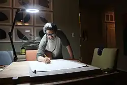Nazar Yahya began his work with metal creating etchings and later continued to works on canvas, as well as paper and photography. In his early career, Nazar worked on experiments with dafatir (singular: daftar); a new expression of artist's book, or art object, possessing a distinct postmodern interpretation of the Islamic manuscript production.[3] During the 1990s and throughout the invasion, Dafatir as a vehicle of expression intensified in Iraq.[3]