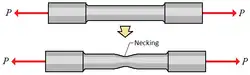 In engineering and materials science, necking is a mode of tensile deformation where relatively large amounts of strain localize disproportionately in a small region of the material. The resulting prominent decrease in local cross-sectional area provides the basis for the name "neck". Because the local strains in the neck are large, necking is often closely associated with yielding, a form of plastic deformation associated with ductile materials, often metals or polymers.[1] Once necking has begun, the neck becomes the exclusive location of yielding in the material, as the reduced area gives the neck the largest local stress.