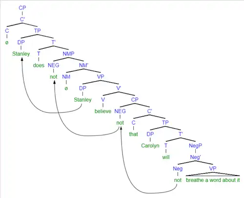 This suggests that the negation originates in the embedded clause, as sister to the VP breathe a word, thus satisfying the locality of selection, being in the embedded clause before participating in raising, moving first to spec CP, and then to its host in the main clause. The analysis proposed by Chris Collins and Paul Postal draws on minimalist syntax, where the negation moves up to the specifier position of the functional projection, Negative Merge Phrase (NMP). Though the phrase is covert, the spec NM position acts as the host to the raised negation.[1]