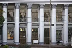 The building is built in a shape of the letter E composed of the main entrance, which is the middle part, and of the wings on both sides of the center. The prominent feature of the central section are wide steps that lead to colonnades of about three-story high and with Corinthian capitals on the upper portion.[7]