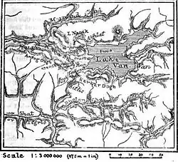 The first systematic studies of the volcano began in the mid-19th century, when, taking advantage of the British influence in the region, it was visited by several European explorers. They described and mapped the area, and some, including the British archaeologist Austen Henry Layard, explored the remains of Urartu fortresses around Lake Van. In this period it was suggested that the unusual structure of the watersheds in the region, and the very formation of Lake Van, is related to a large volcanic eruption and the blocking of the water discharge to Murat River by the lava flow.[9][10]