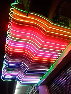 Neon illumination is valuable to invoke the 1940s or 1950s nostalgia in marketing and in the historic restoration of architectural landmarks from the neon era. Architecture in the streamline moderne era often deployed neon to accent structural pigmented glass built into the façade of a 1930s or 1940s structure; many of these buildings now qualify for inclusion on historic registers such as the U.S. National Register of Historic Places if their historic integrity is faithfully maintained.[36] In the latter half of the 20th century, neon signs found a distinct place in artistic installations and nightlife districts, particularly during the 1980s and 1990s, when they became symbols of vibrant, modern design. Today, neon signs continue to be used for their nostalgic aesthetic appeal and unique lighting effects, often seen in boutique branding, interior decoration, and public art.[31][26]