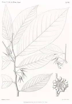 | Black and white botanical illustration of Neostenanthera myristicifolia (using the synonym Stenanthera pluriflora)[1] | |